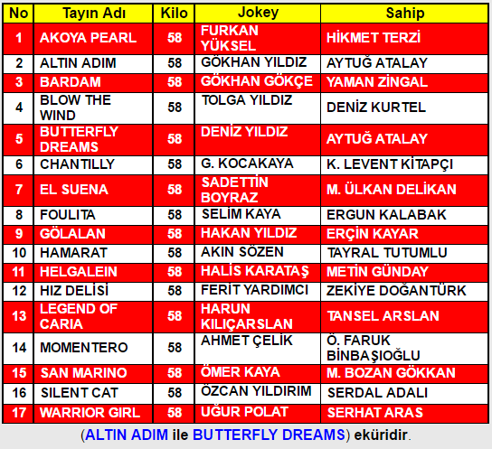 Saat 18:00’de başlayacak Erkek Tay Deneme Koşusu’nda 16, Saat 16:00’da start alacak Dişi Tay Deneme Koşusu’nda ise 17 safkan çim pistte 1600 metre mesafede birincilik mücadelesi verecek. Türk yarışçılığının klasiklerinde, birinci gelecek taylar sahiplerine yaşattığı gururun yanı sıra, 400.000 TL para ödülü de kazandıracak.