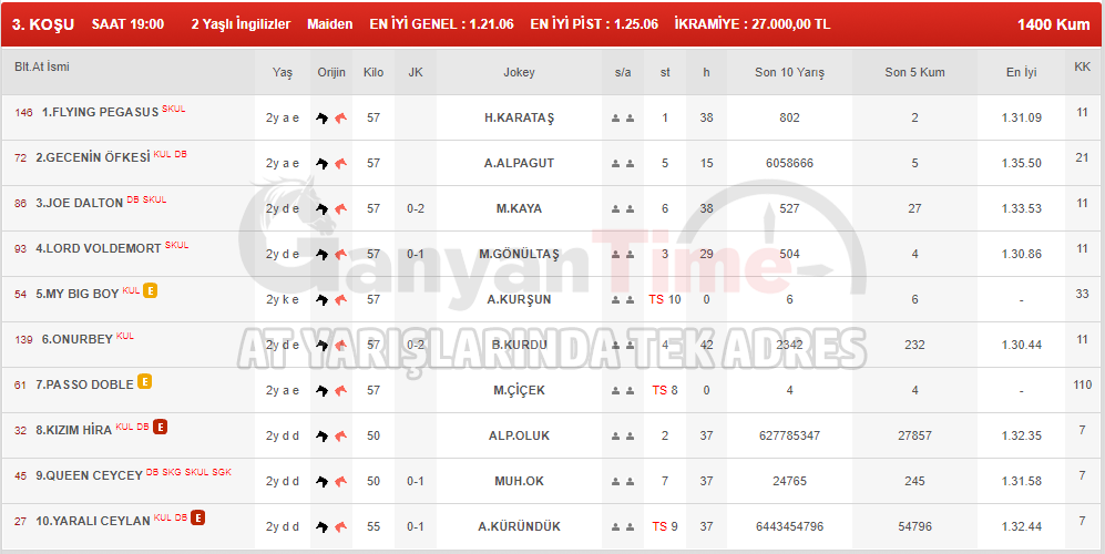 | B.Puan | At İsmi | Yaş | Kilo | Jokey Adı | St | HK |