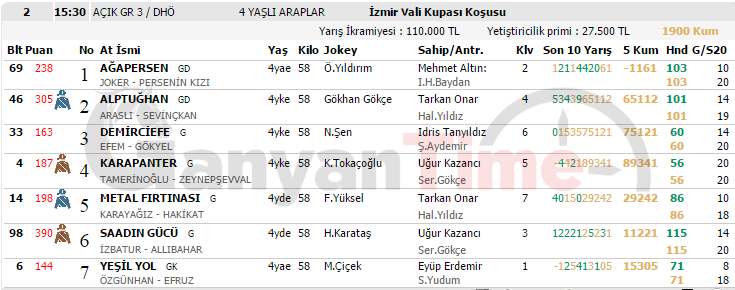 19 Şubat İZMİR Puanlı Yarış Bülteni, TJK At Yarışı Programı