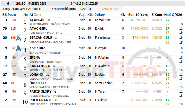 6 Şubat ŞANLIURFA Puanlı Yarış Bülteni, TJK At Yarışı Programı