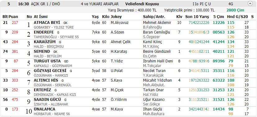 17 Eylül İSTANBUL Puanlı Yarış Bülteni, TJK At Yarışı Programı