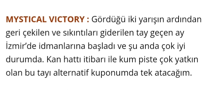 MYSTICAL VICTORY : Geçen yarışındaki yorumumdan farklı olarak bu kez direkt banko olarak öneriyorum.