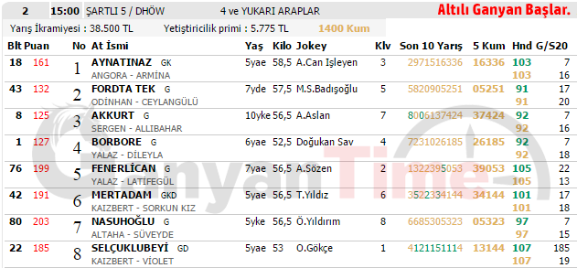 Güncel ücretsiz at yarışı tahminleri, altılı ganyan tahmini, at yarışı programı, at yarışı koşu sonuçları, muhtemel ganyanlar, AGF tabloları, gazete ve bültenlerin tahminleri, gazete ve bültenlerin bilgisayar analizleri, detaylı yarış istatistikleri, galoplar, yarış dereceleri, idman pisti görüntüleri, yazarların tahminleri, günün tekleri/bankoları, günün sürprizleri, günün bomba atları, takı değişiklikleri, yarış hayatı riskli atlar, günün pist ve hava durumu, bilgisayar puanlı yarış/altılı bülteni, canlı TJK TV, at yarışı kupon hesaplama, altılı ganyan ve tüm diğer bahis oyunlarını hesaplama gibi bir çok ücretsiz at yarışı içeriklerinin bulunduğu Ganyan Time’a hoş geldiniz.