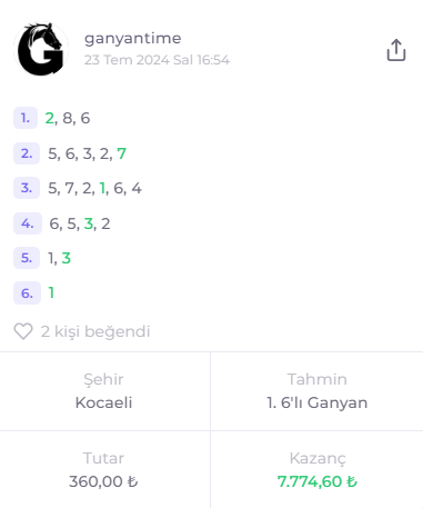 23 Temmuz 2024 Kocaeli 1. Altılı Ganyan tahminimiz 7.774,60 TL kazandırdı.